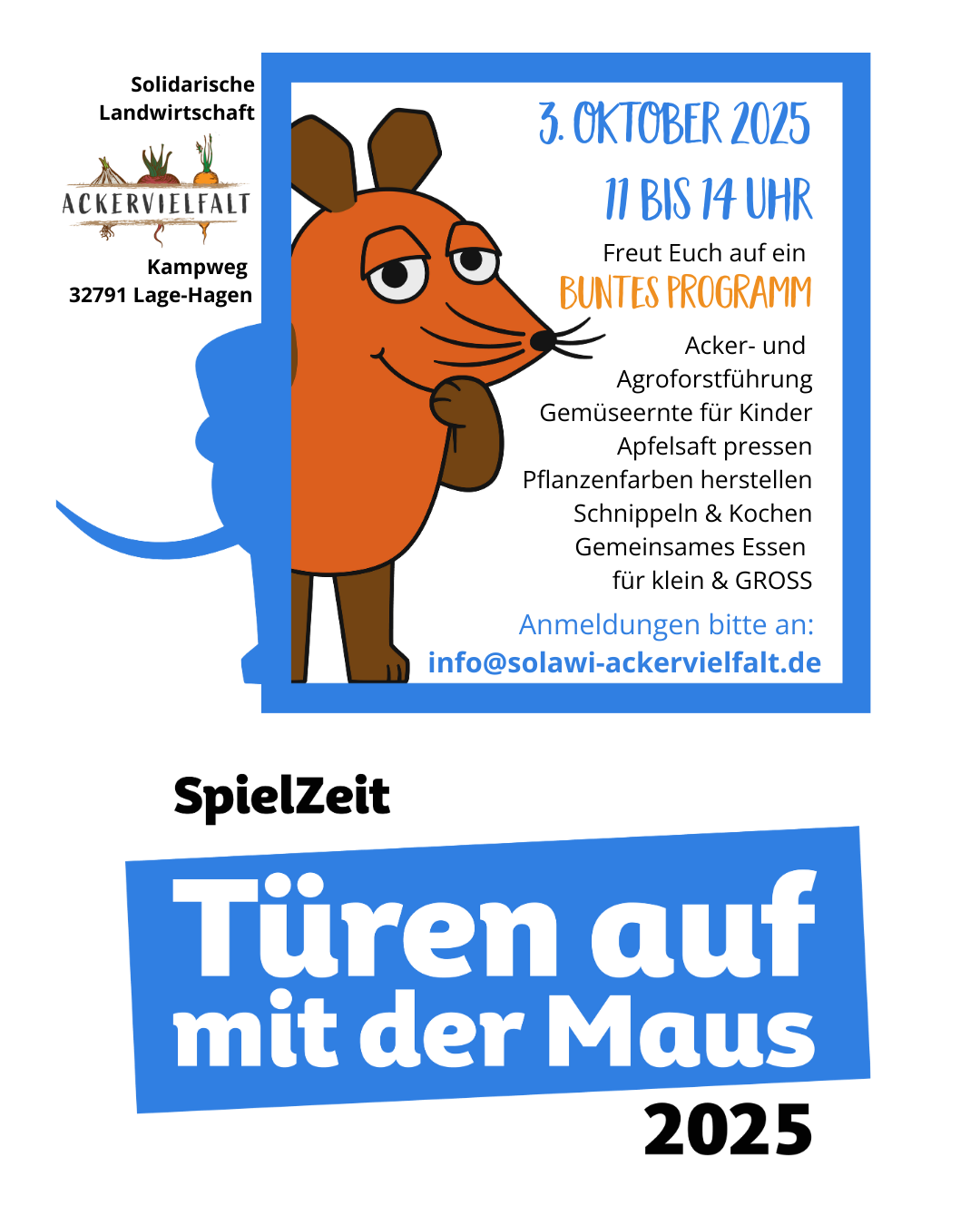 m 3. Oktober öffnet unsere SoLaWi ihre Türen für kleine und große Entdecker:innen! Erlebe Landwirtschaft hautnah: Ernte dein eigenes Gemüse, presse frischen Apfelsaft, male mit selbst hergestellten Pflanzenfarben (danke an Jochen von der Solidarischen Landwirtschaft Dalborn, dass Du uns mit diesem tollen Angebot am Maus-Tag besuchen kommst!) und entdecke mit Lupen das geheime Leben im Boden. Spielerisch erkunden wir, warum Bäume im Agroforst echte Klimahelden sind und wie nachhaltiger Gemüseanbau funktioniert. In der Schnippeldisco verwandeln wir frische Zutaten in leckere Gerichte. Ein Tag voller Spaß, Wissen und Mitmach-Aktionen wartet auf dich!